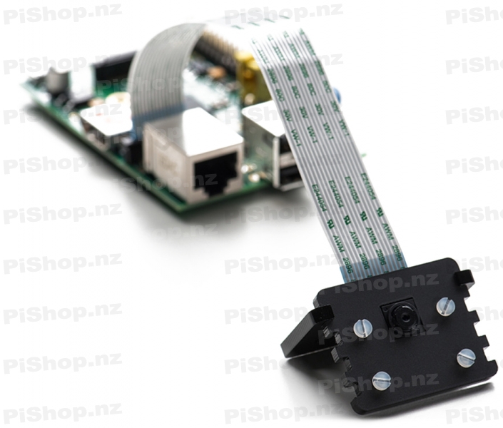 This adjustable Pi Camera mount is a great accessory for Pi shutterbugs. Little screws attach the Pi Camera solidly and the design allows for multiple positions. There's also a 1/4" hole that you can use to attach the camera to a standard camera tripod mount.