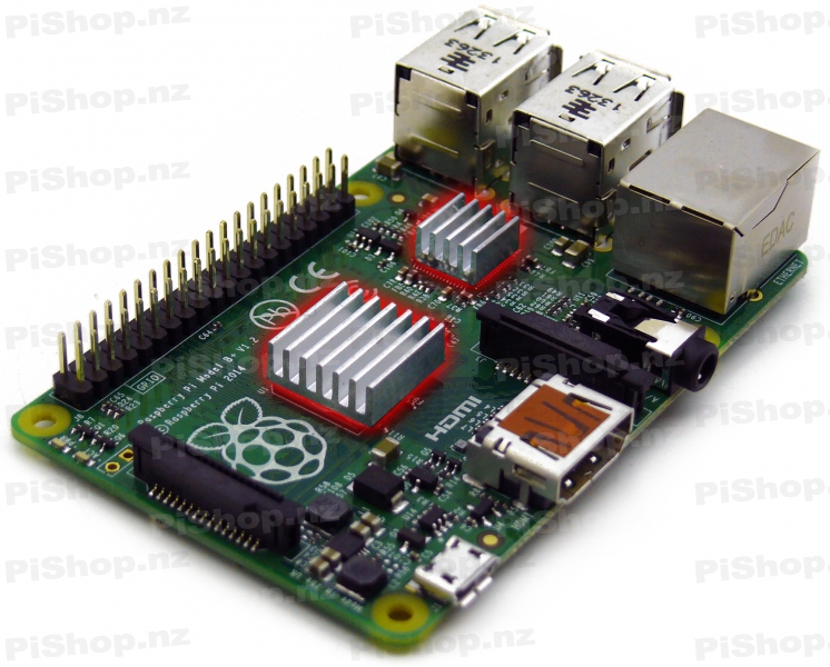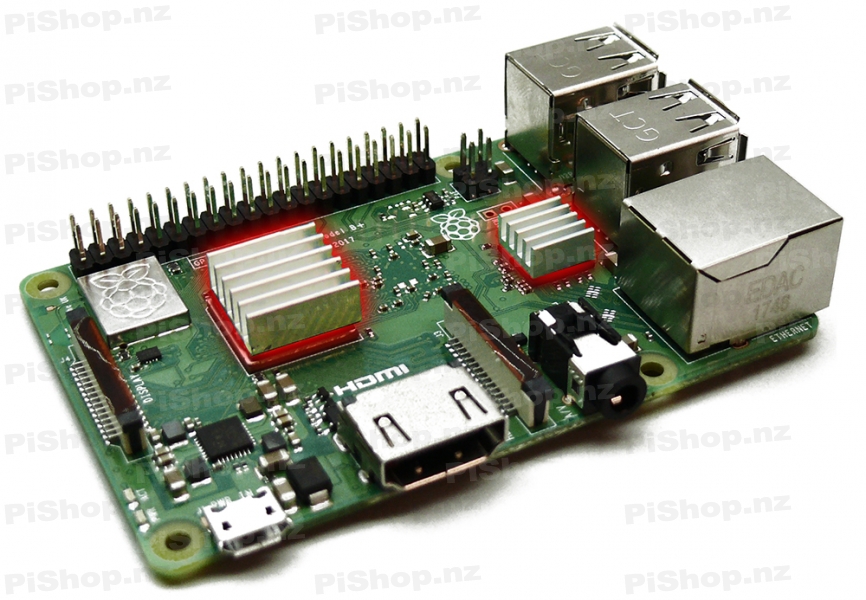 The Raspberry Pi Heat Sink Kit consists of three high quality aluminium heat sinks, each selected to perfectly match the size of the three main heat out-put components on your Raspberry Pi board. Also included is a 3M double sided adhesive pad which can be cut and used to stick each heat sink down securely and create a perfect heat-transfer bond.