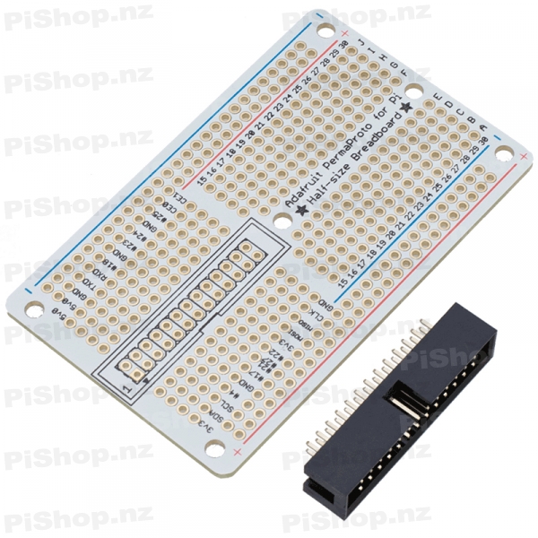 We put a PermaProto half sized proto board in a blender with a Pi Cobbler and out emerged this very tasty confection - the PermaProto for Pi! It has the Cobbler baked right in. Simply solder the 2x13 pin header in and you get all the labeled breakouts with tons of prototyping space, power rails, mounting holes and that gorgeous silk.